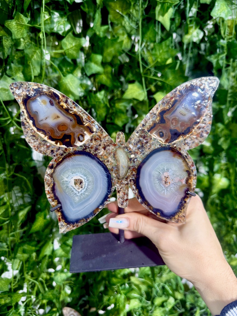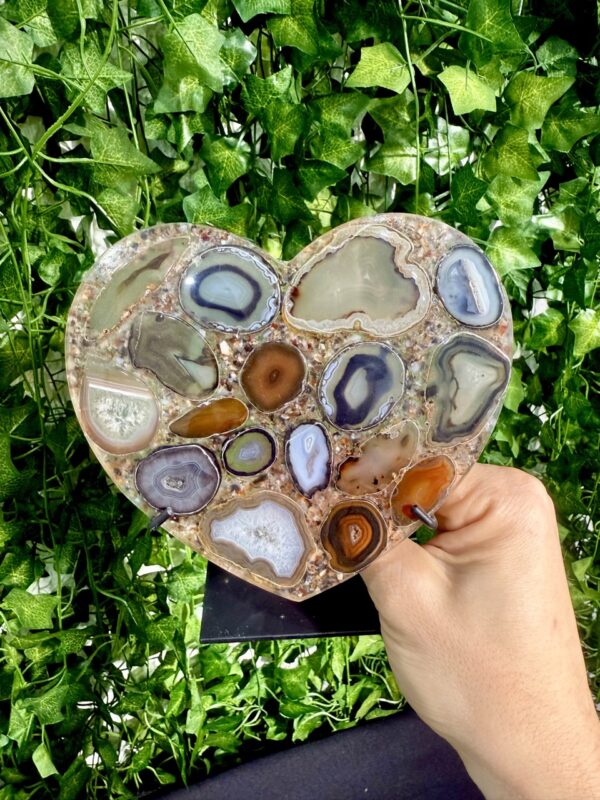 Infuse your space with love, harmony, and natural artistry with this exquisite Resin Agate Heart on Stand. Painstakingly handcrafted, this statement piece combines the timeless allure of genuine Brazilian agate slices with contemporary resin artistry. The result is a one-of-a-kind sculpture that radiates beauty and positive energy from every angle.