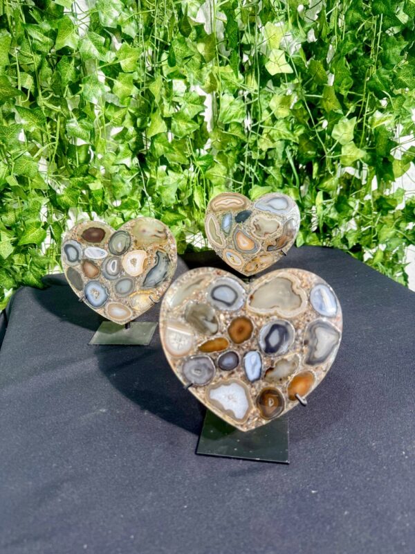 Every heart rests gracefully on a robust wooden or metal stand, perfectly poised for display on a shelf, desk, mantle, or nightstand. The semi-translucent quality of the agate shines against the resin, catching and refracting ambient light to create an ever-changing play of color and pattern that mesmerizes the eye.