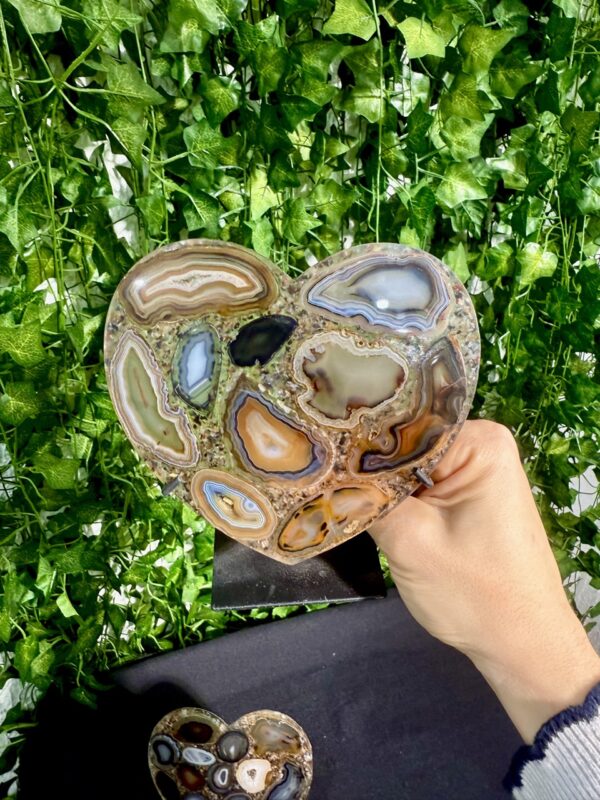 Elegant decorative heart featuring genuine Brazilian agate slices beautifully encased in crystal-clear resin and displayed on a sturdy stand. Each piece showcases unique agate banding and natural earth tones, highlighted by the smooth, polished resin finish. Perfect as a symbol of love and harmony, this heart sculpture brings warmth and a touch of natural artistry to home or office decor, meditation spaces, or as a meaningful gift. Every heart is one-of-a-kind due to the natural variations in agat