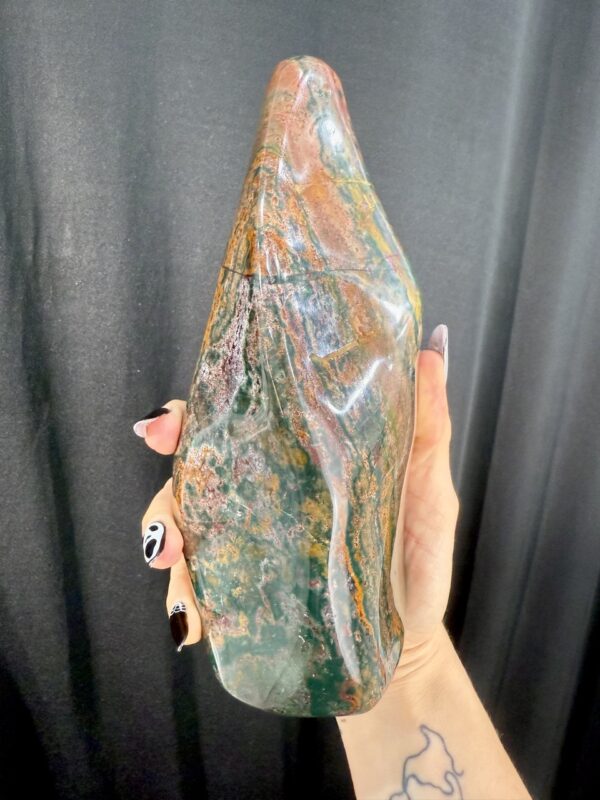 A hand-polished, free form sculpture of green and red jasper, featuring rich earthy swirls and a glossy finish. Grounds, protects, and nurtures—perfect for décor, meditation, or as a unique crystal gift.