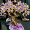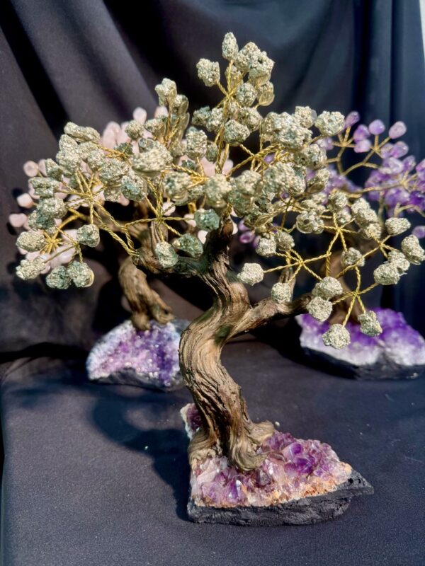 This vibrant miniature tree is rooted atop a genuine Brazilian amethyst cluster, whose sparkling violet crystals provide both a sturdy base and an infusion of calming, uplifting energy. Amethyst is cherished for its ability to promote tranquility and purification, making it the ideal foundation for your gemstone tree.