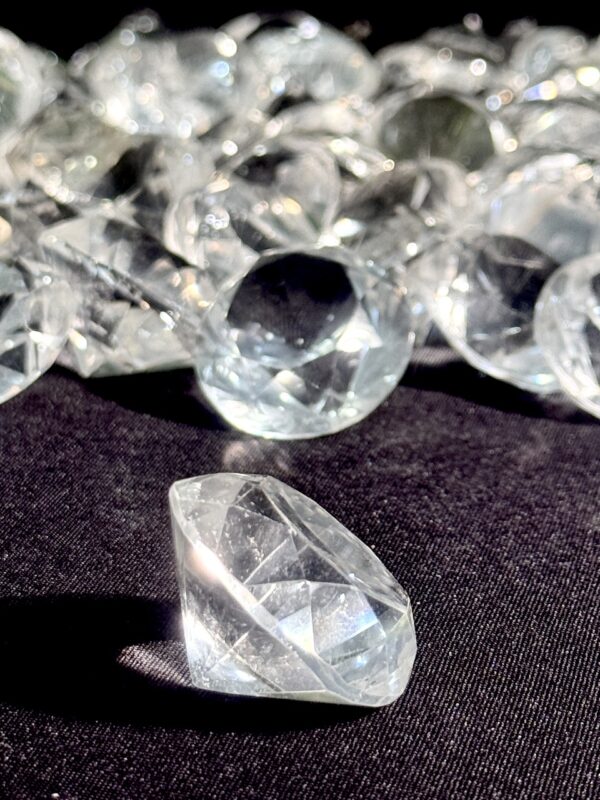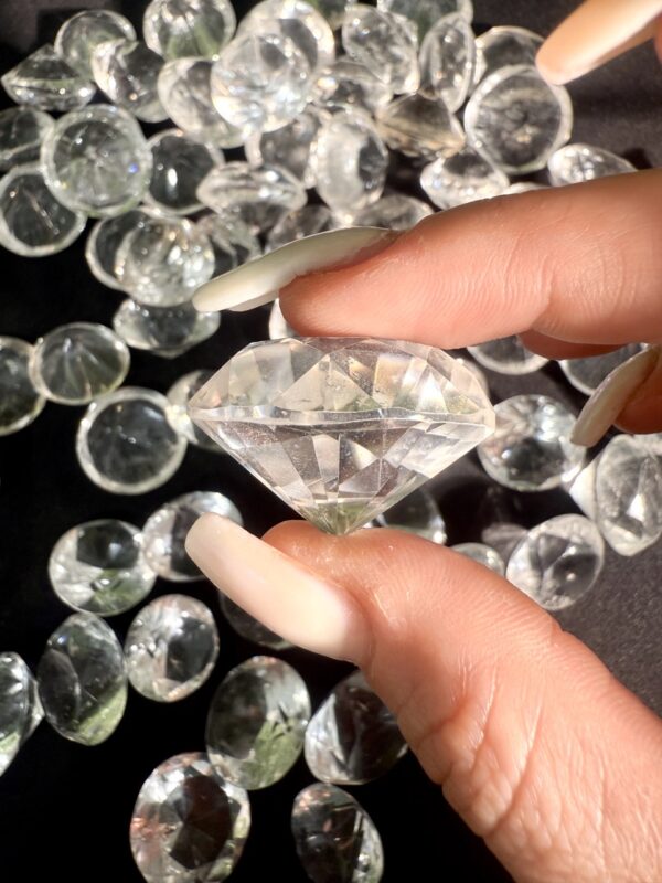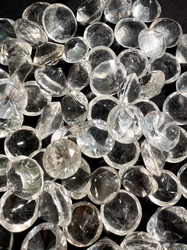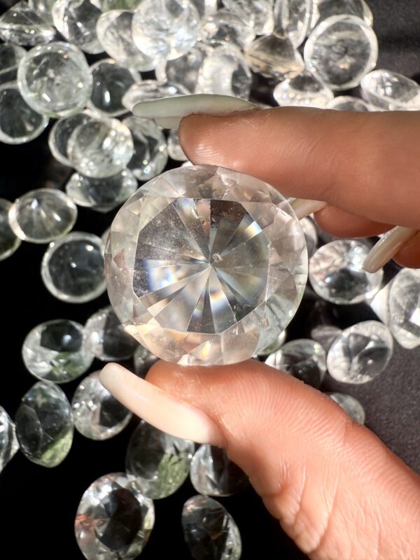 A small, hand-cut clear quartz diamond, symbolizing clarity and abundance. A beautiful and powerful tool for meditation, energy work, or as a decorative accent.
