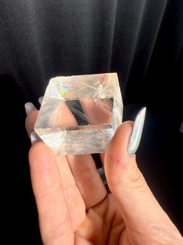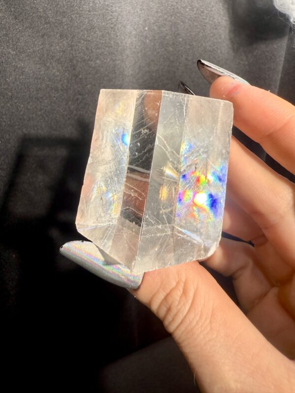Each optical calcite specimen is unique, with its own rainbows, natural growth lines, internal veils, and subtle inclusions. Whether displayed for its sparkling beauty, used as a functional tool, or appreciated for its metaphysical benefits, this stone brings light, clarity, and positive energy into your daily life.