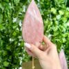 A hand-carved rose quartz flame in soft, soothing pink, elegantly mounted on a stand. Radiates loving, calming energy—ideal for décor, meditation, or gifting to someone special.