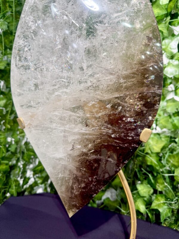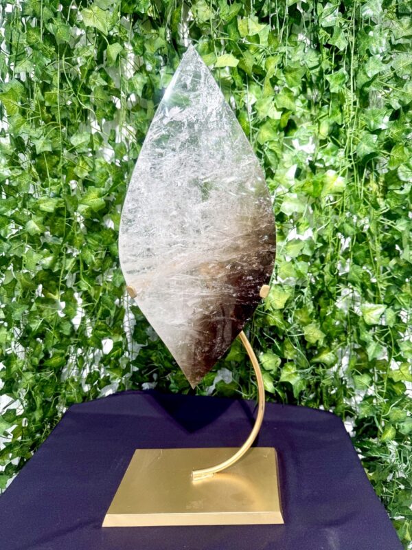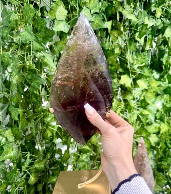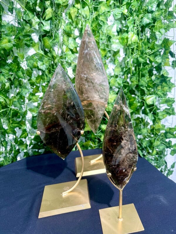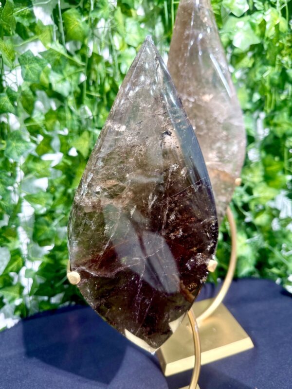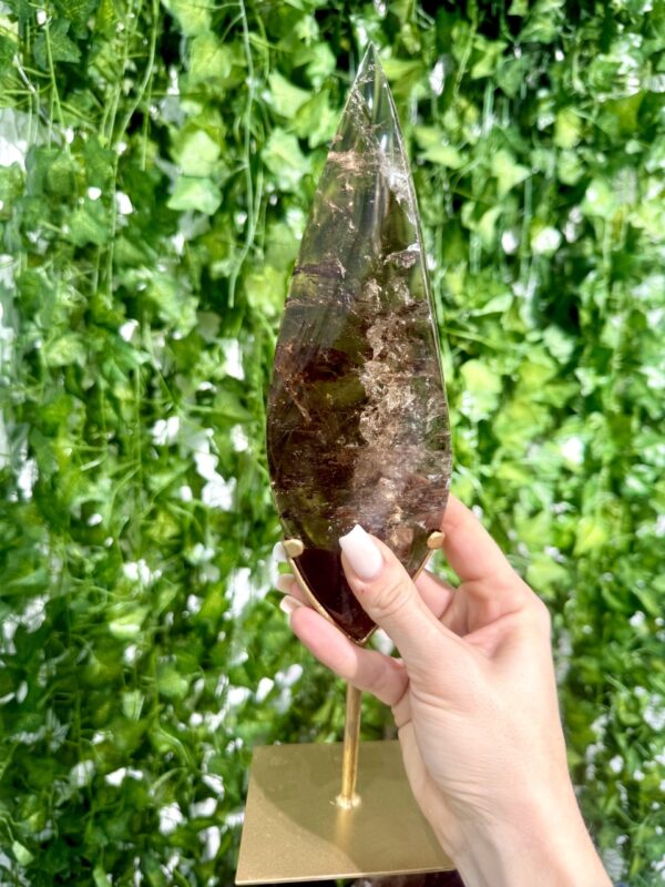 A polished smokey quartz flame set on a stand, radiating grounding and protective energy. Ideal for meditation, energy work, or as a serene, elegant décor piece.