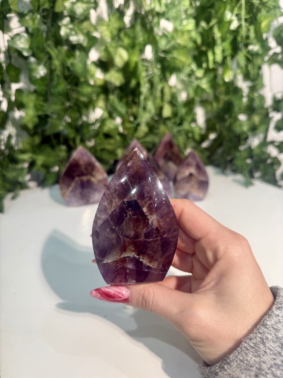 The Super Seven Heart showcases a stunning palette of colors—deep purples, smoky greys, golden threads, and fiery reds—creating a visual tapestry that reflects the dynamic interplay of its elements. Each piece is unique, unveiling its own distinct patterns and inclusions, making it a one-of-a-kind gem in any collection.